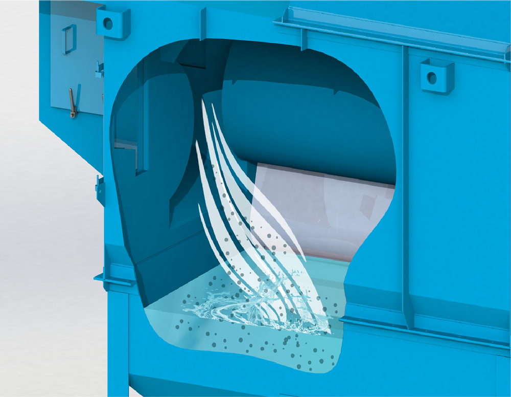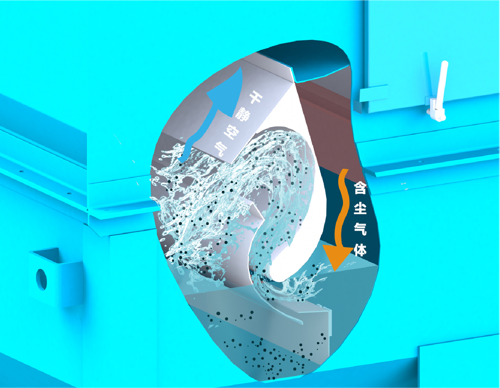 經(jīng)過離心分離室離心處理的空氣進入到洗滌室,此時空氣中的絕大部分粉塵顆粒都已經(jīng)被處理掉。洗滌室有一個精心設(shè)計的漩渦狀風道,空氣進入漩渦狀通道后,運動方向會產(chǎn)生劇烈改變,從而在液面上激起無數(shù)的水花和霧滴,極少量未處理掉的粉塵顆粒,在通過這些水花和霧滴時,又進一步被洗滌和吸附,含塵空氣被凈化干凈。凈化干凈的空氣由此從除塵工藝轉(zhuǎn)向脫水工藝。