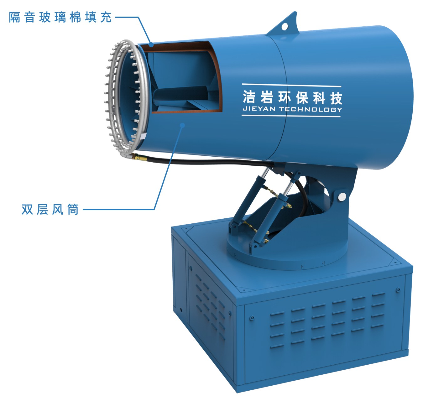 智能超細遠程射霧器是根據風送原理,先使用先進的高壓泵、超細霧化噴嘴將水霧化,將常態溶液霧化成0~30μm的細小霧粒。在風機的作用下,將霧定向拋射到指定位置,在塵埃處及其上方或者周圍進行噴霧覆蓋。粉塵顆粒與水霧充分的融合,逐漸凝結成顆粒團,在自身的重力作用下快速沉降到地面,從而達到降塵的目的。